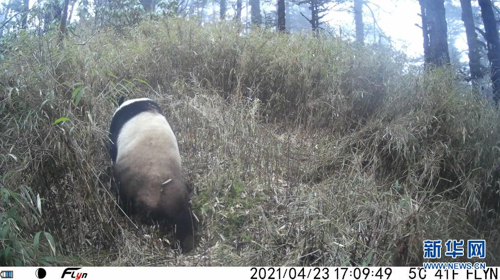 4月23日,卧龙牛头山海拔约3200米左右区域的红外触发相机拍下的野生大熊猫。新华社发(大熊猫国家公园管理局供图)