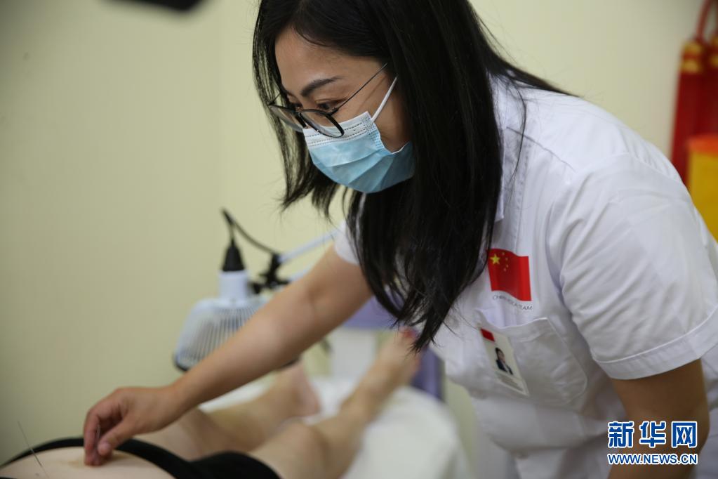 4月27日,在马耳他保拉市地中海地区中医中心,第16期援马耳他医疗队队长蒋亚文医生给患者做针灸治疗。