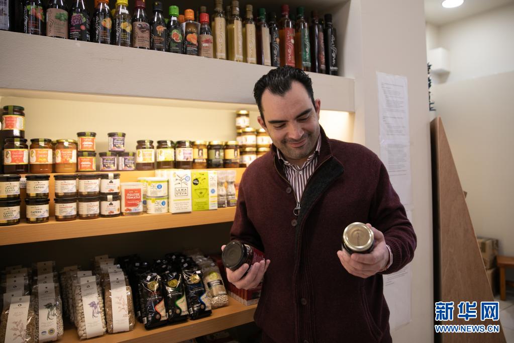 4月1日,在希腊麦西尼亚大区首府卡拉马塔市,一名男子看着手中的卡拉马塔黑橄榄产品。