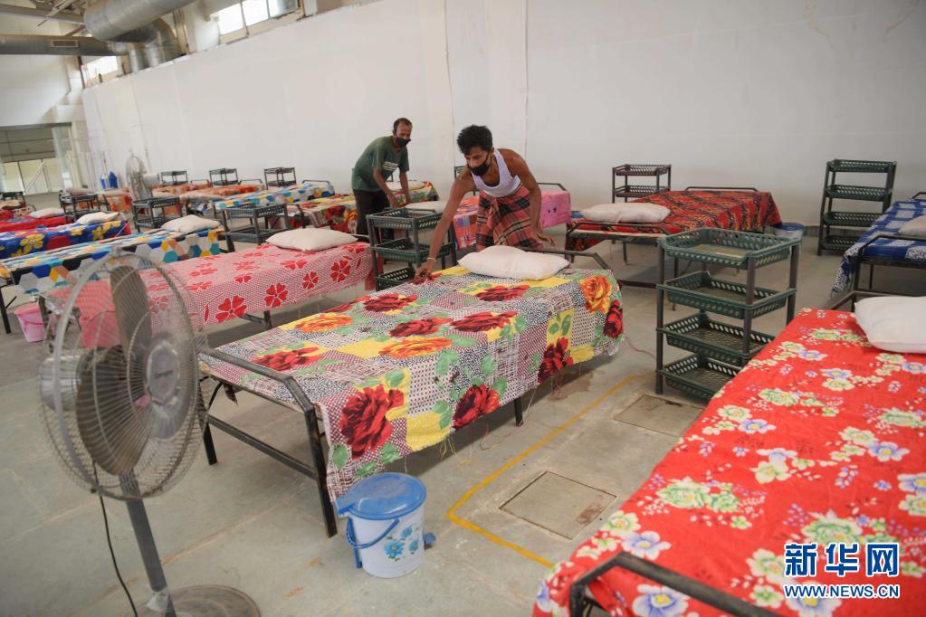 4月30日,工作人员在印度阿加尔塔拉郊外的一处新冠隔离中心整理床铺。