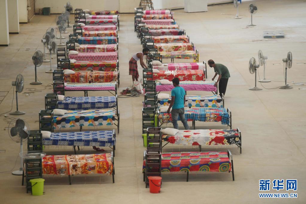 4月30日,工作人员在印度阿加尔塔拉郊外的一处新冠隔离中心整理床铺。
