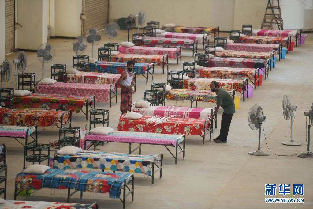 4月30日,工作人员在印度阿加尔塔拉郊外的一处新冠隔离中心整理床铺。