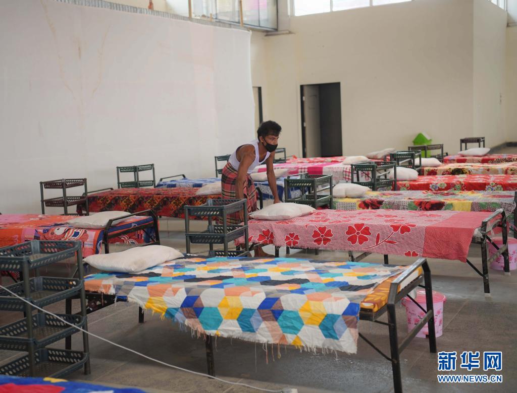 4月30日,工作人员在印度阿加尔塔拉郊外的一处新冠隔离中心整理床铺。