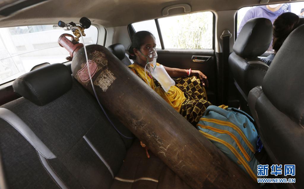 4月30日,在印度艾哈迈达巴德,一名女子在车上吸氧。