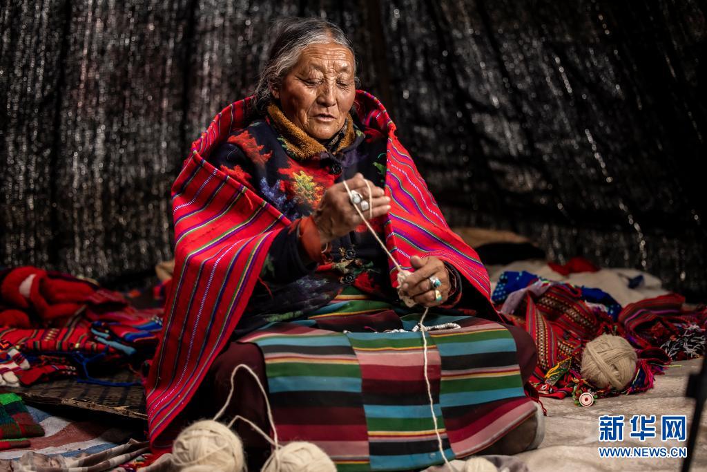 才旦拉姆老人在家里编织氆氇(4月27日摄)。新华社发(贡觉群培摄)