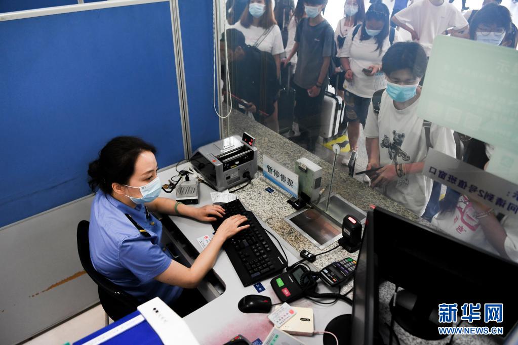 5月1日,重庆火车站售票厅工作人员为旅客办理购票手续。