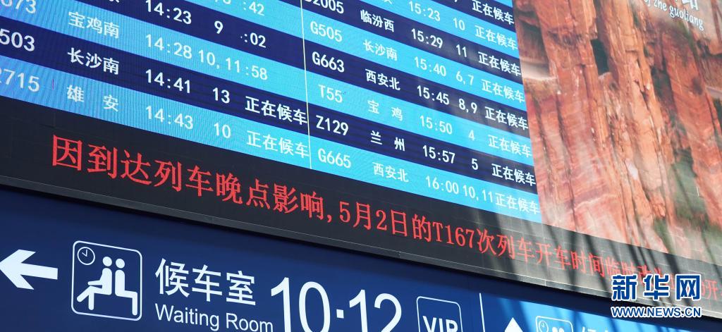 5月2日,北京西站站内显示屏上列车晚点的提醒信息。 新华社记者 彭子洋 摄