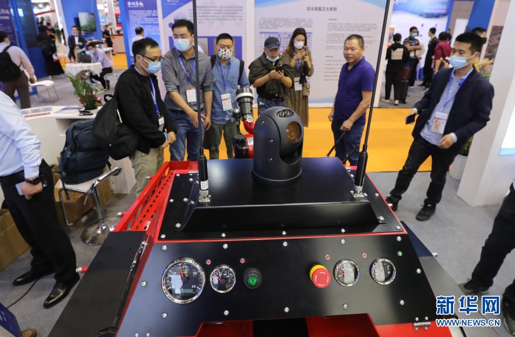 5月7日,参观者在一款消防救援机器人展品旁驻足观看。