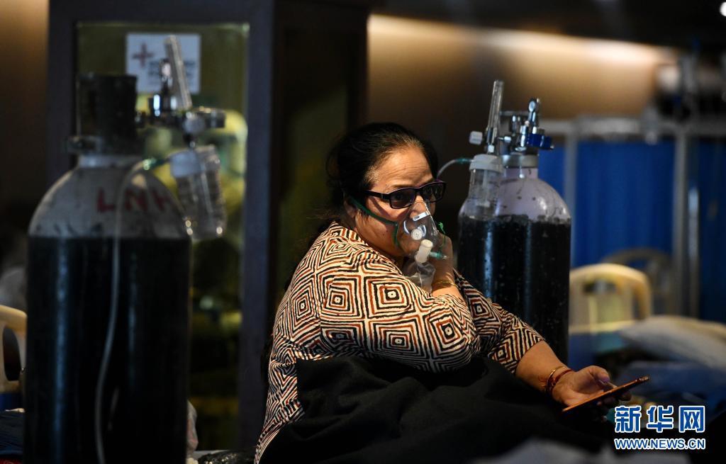 5月8日,新冠患者在印度新德里的一处隔离中心吸氧。