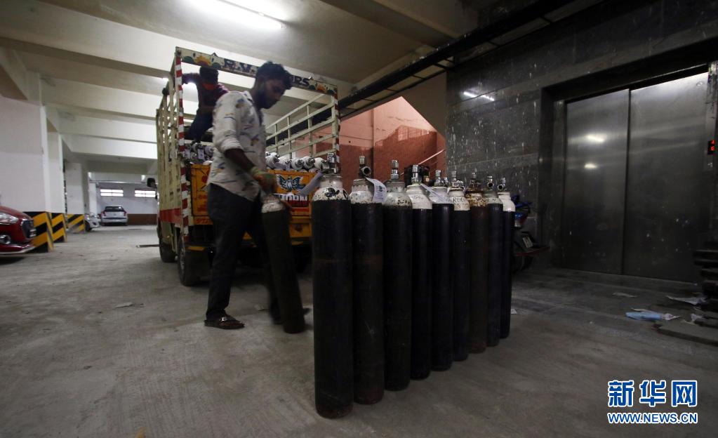 5月8日,在印度金奈的一所医院,工作人员运送氧气罐。