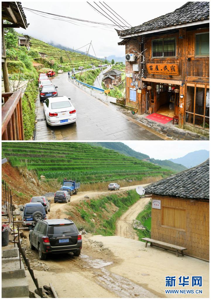 这是一张拼版照片。上图为2021年5月4日,游客的车辆停在加榜梯田新修的旅游公路旁(新华社记者 杨文斌 摄);下图为2011年,游客的车辆行驶在加榜梯田的老公路上(新华社发,莫晓树 摄)。