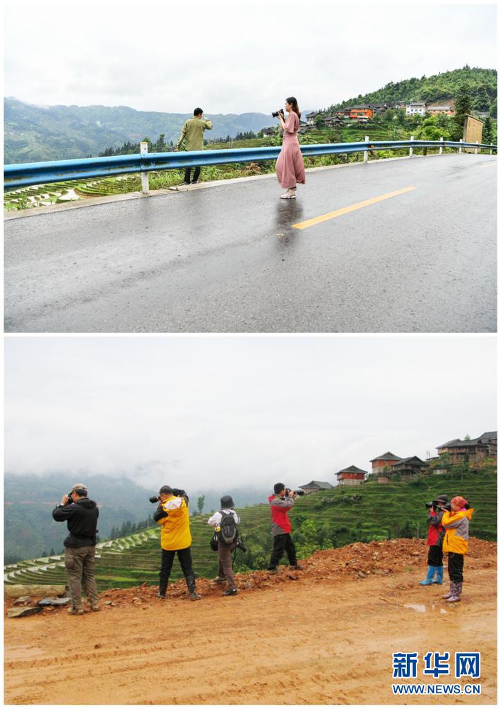 这是一张拼版照片。上图为2021年5月4日,游客在加榜梯田新修的旅游公路旁拍照(新华社记者 杨文斌 摄);下图为2011年,游客在加榜梯田的老公路旁拍照(新华社发,莫晓树摄)。