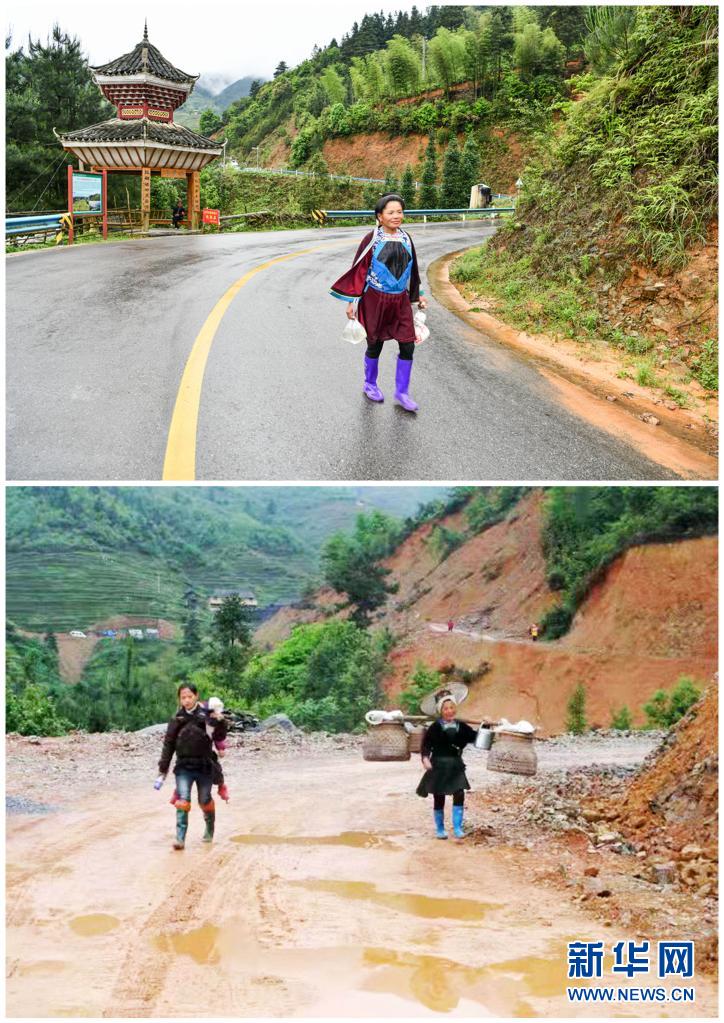 这是一张拼版照片。上图为2021年5月4日,村民走在加榜梯田新修的旅游公路上(新华社记者 杨文斌 摄);下图为2011年,村民走在加榜梯田泥泞不堪的老公路上(新华社发,莫晓树摄)。