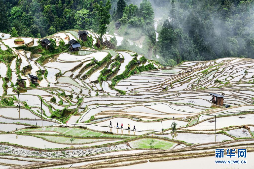 村民在雨后的加榜梯田间行走(5月4日摄)。