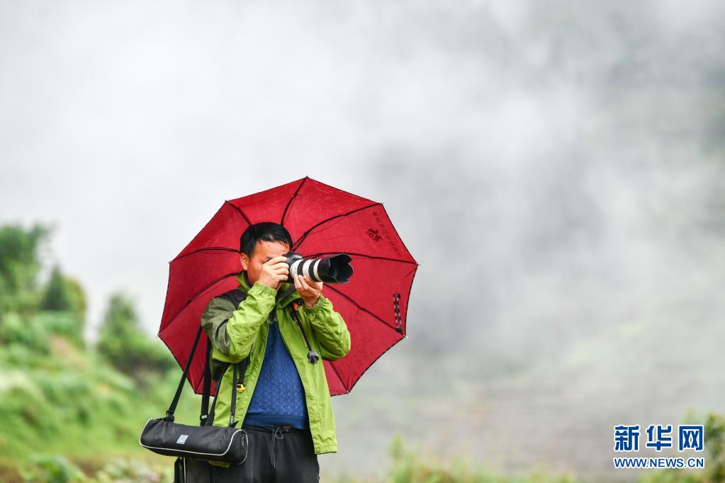 莫晓树在拍摄雨中的加榜梯田(5月4日摄)。