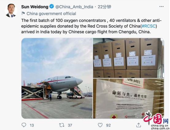 中国驻印度大使孙卫东在社交平台发布消息,中国红十字会向印捐赠制氧机等物资,并提供100万美元援助
