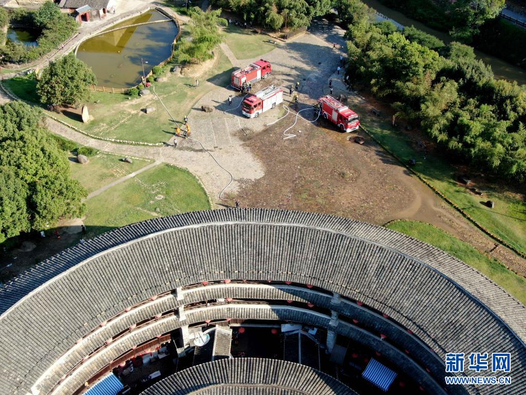 5月10日,消防队员在福建省龙岩市永定土楼进行灭火救援演练(无人机照片)。
