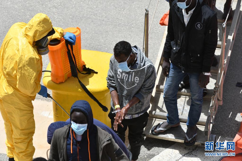 5月11日,佩戴口罩的非法移民在马耳他森格莱阿下船后接受消毒。