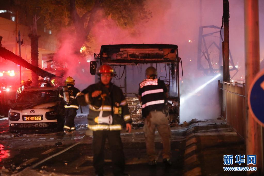 5月11日晚,靠近特拉维夫的以色列中部城市霍隆遭加沙地带火箭弹袭击后,救援人员为一辆被击中的公共汽车灭火。