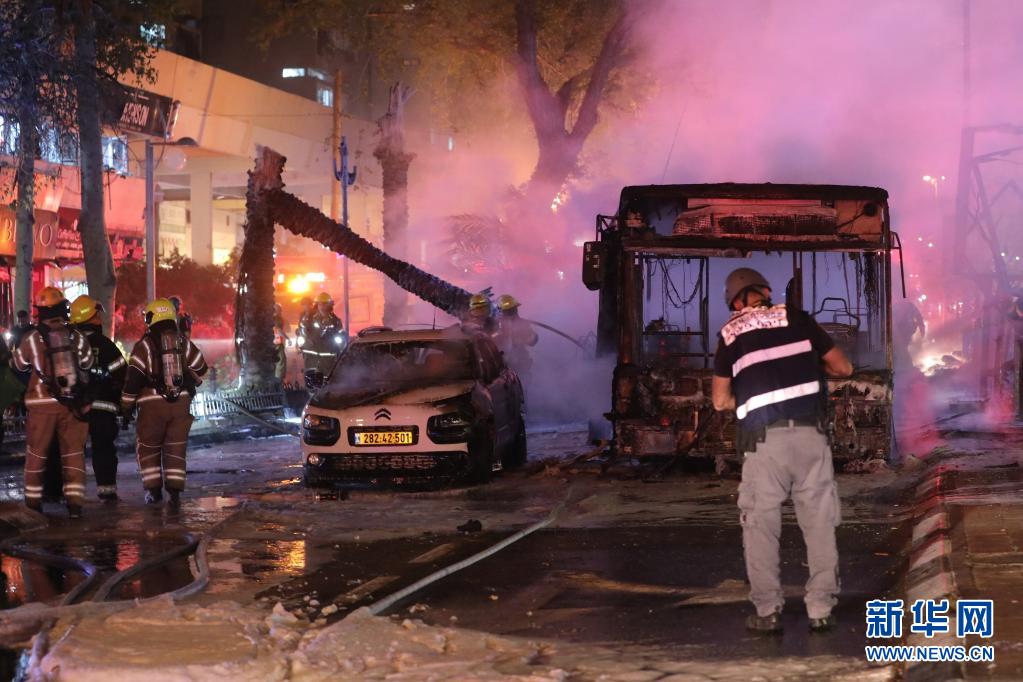 5月11日晚,靠近特拉维夫的以色列中部城市霍隆遭加沙地带火箭弹袭击后,救援人员为一辆被击中的公共汽车灭火。