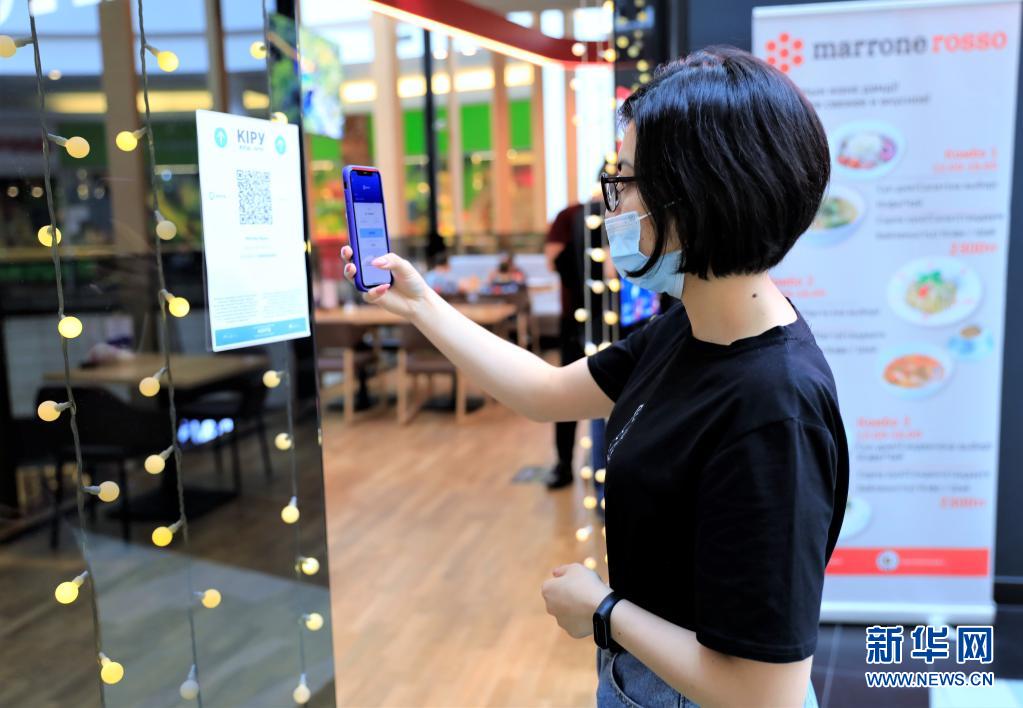 5月13日,哈萨克斯坦首都努尔苏丹市民在一家餐厅门口扫描健康码识别健康状况。
