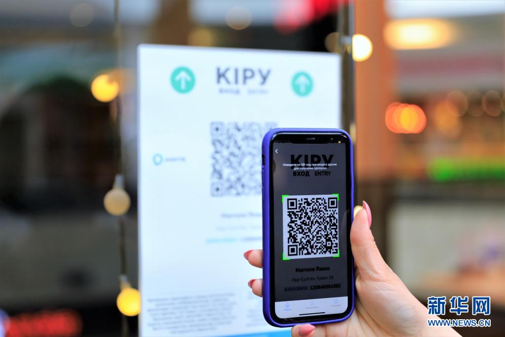 5月13日,哈萨克斯坦首都努尔苏丹市民在一家商场门口扫描健康码识别健康状况。