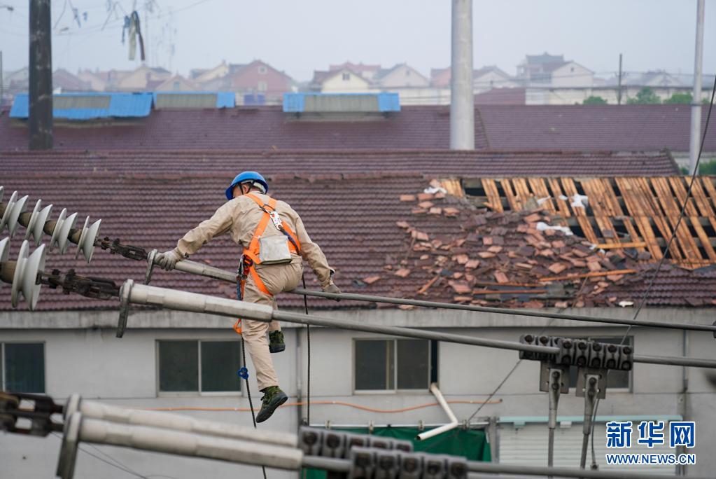 5月15日,国网苏州供电公司的工作人员在盛泽镇抢修受损的电力设施。