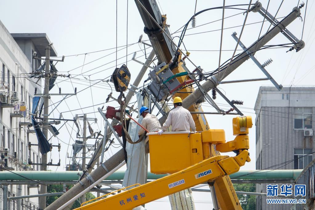 5月15日,国网苏州供电公司的工作人员在盛泽镇抢修受损的电力设施。