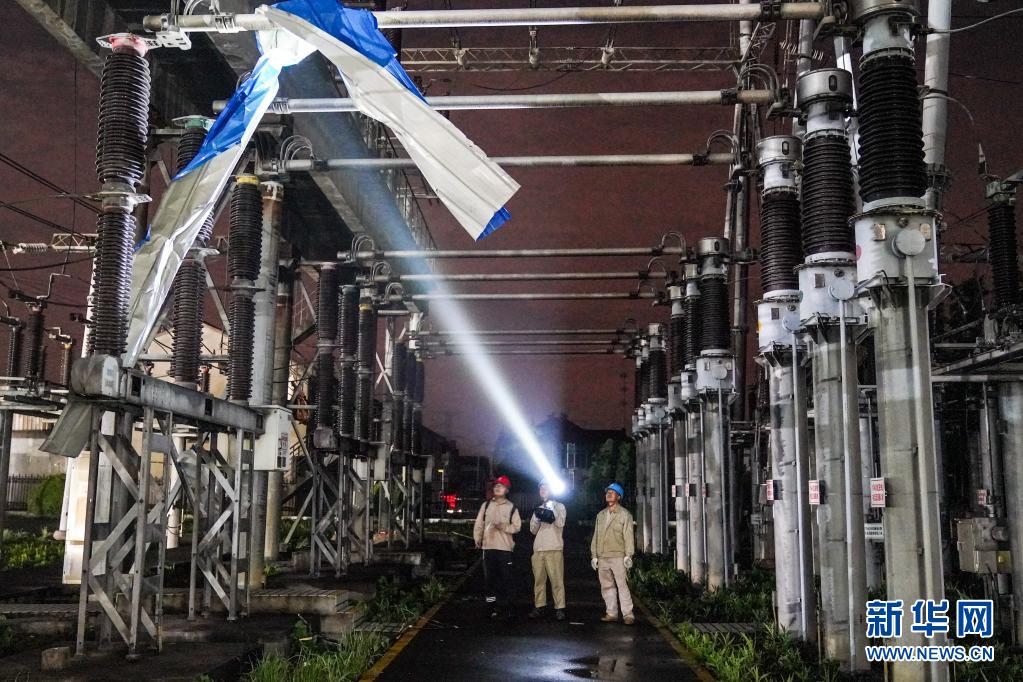 国网苏州供电公司的工作人员在盛泽镇抢修受损的电力设施(5月14日摄)。