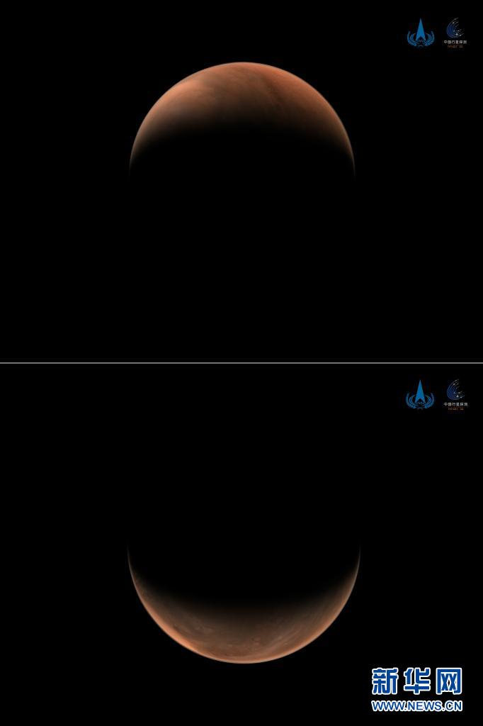 2021年3月26日,国家航天局发布2幅由我国首次火星探测任务天问一号探测器拍摄的南、北半球火星侧身影像。这是一张拼版照片,上图为:北半球上方火星影像;下图为:南半球上方火星影像。