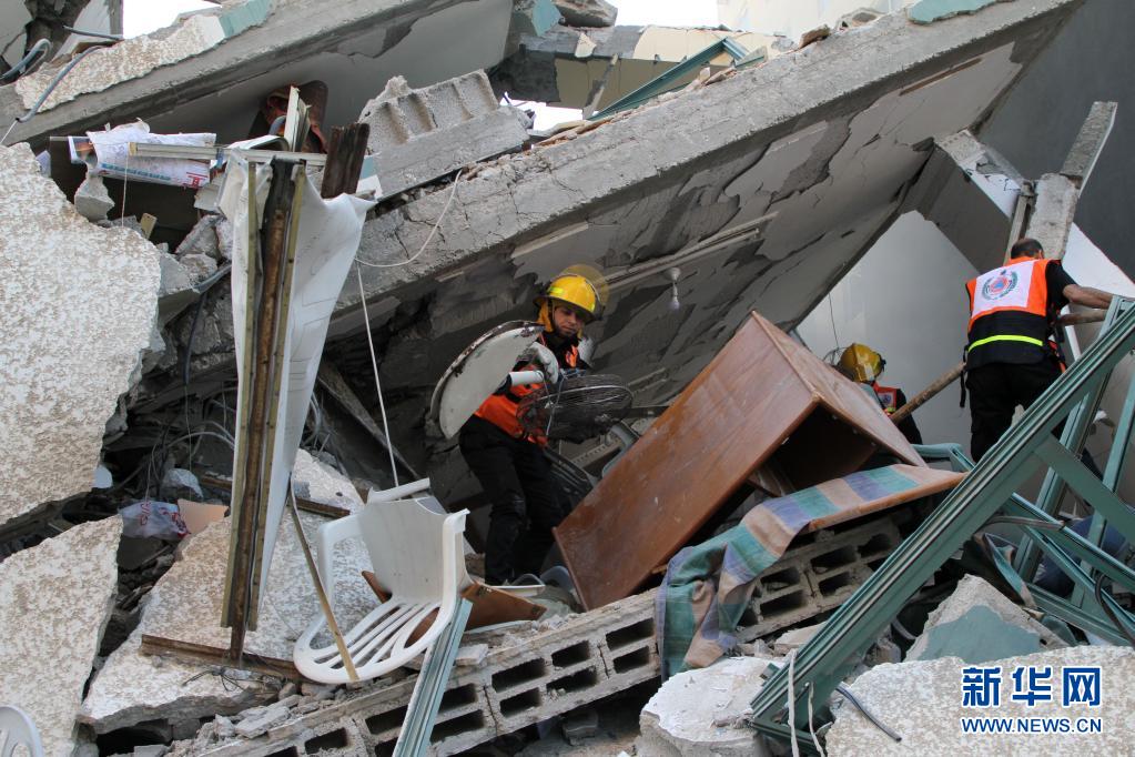 5月15日,巴勒斯坦人查看被以军空袭过后的位于加沙地带的一栋多家媒体所在大楼。