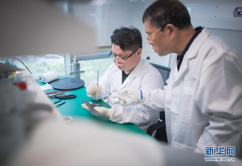 方国荣(右)指导儿子方晨在修复一件出土的青铜戈(5月14日摄)。