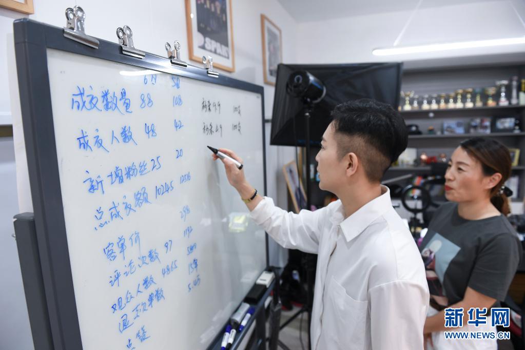 5月7日,何禹霏(左)和员工在办公室进行直播的复盘和准备。