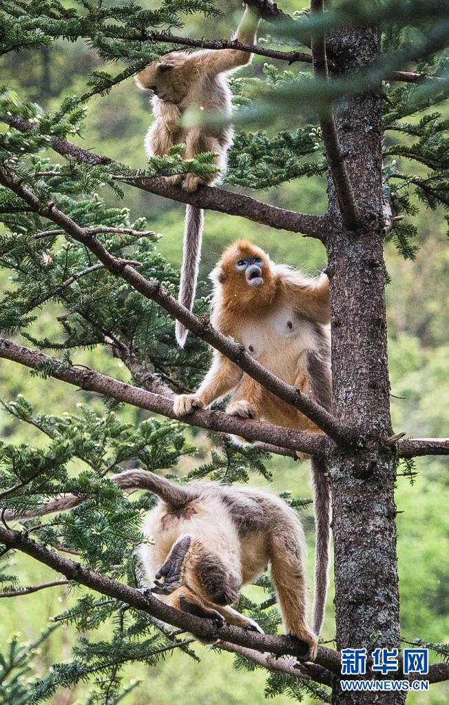 5月19日,金丝猴在神农架国家公园大龙潭金丝猴野外研究基地山林中活动。