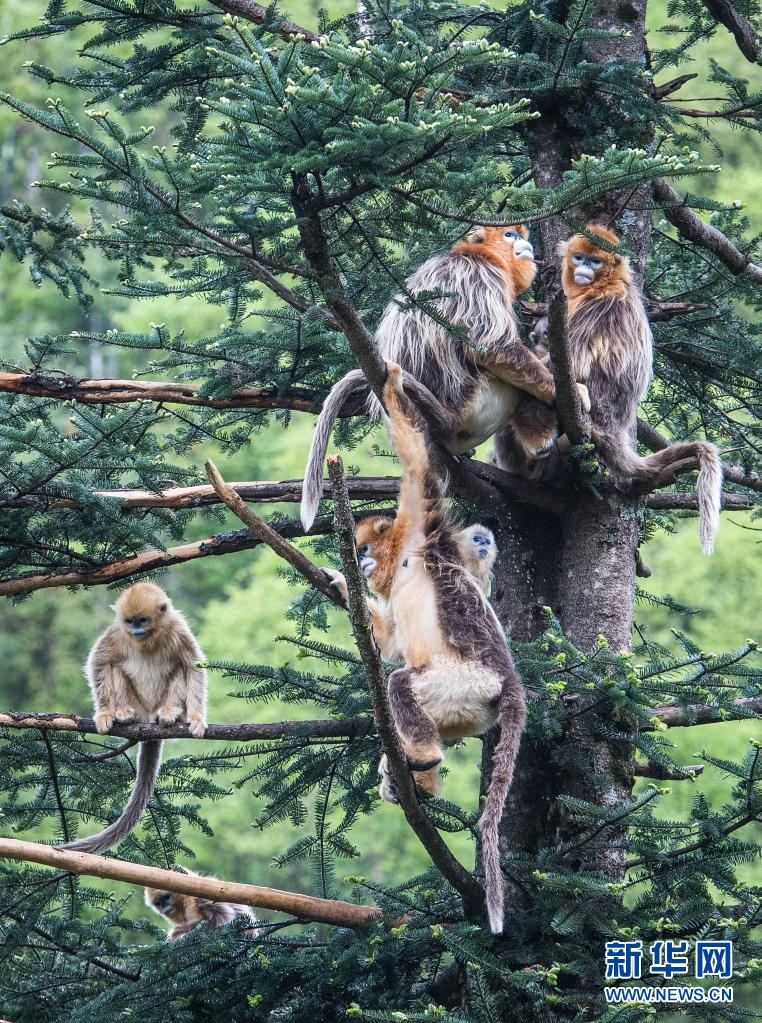 5月19日,金丝猴在神农架国家公园大龙潭金丝猴野外研究基地山林中活动。