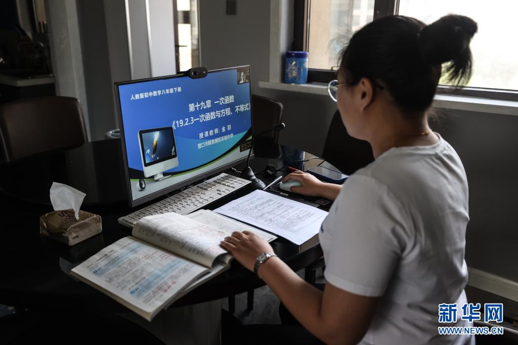 5月21日,鲅鱼圈区实验中学老师金羽在家中为学生上网课。