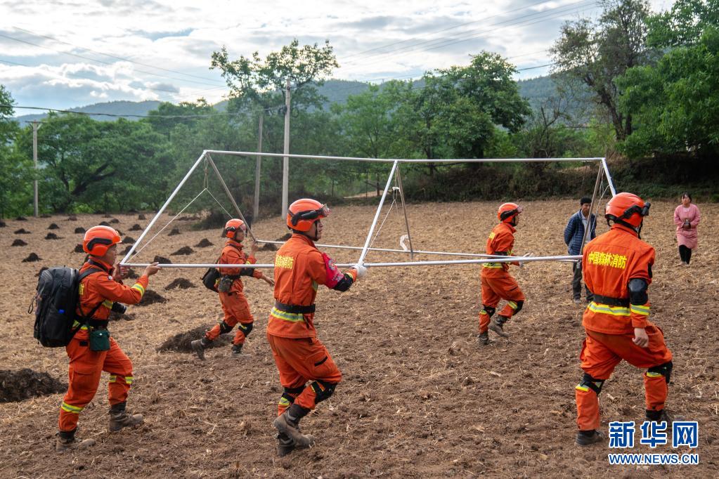 5月22日,消防官兵在云南省漾濞县秀岭村的安置点搭建帐篷。
