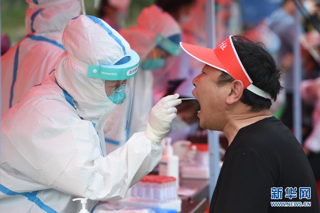 5月22日,在六安市裕安区振兴社区,检测人员为居民进行核酸采样。