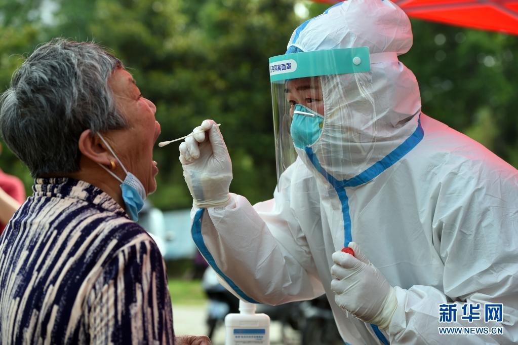 5月22日,在六安市裕安区振兴社区,检测人员为居民进行核酸采样。