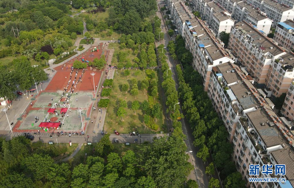 5月22日,在六安市裕安区振兴社区,检测人员为居民进行核酸采样(无人机照片)。