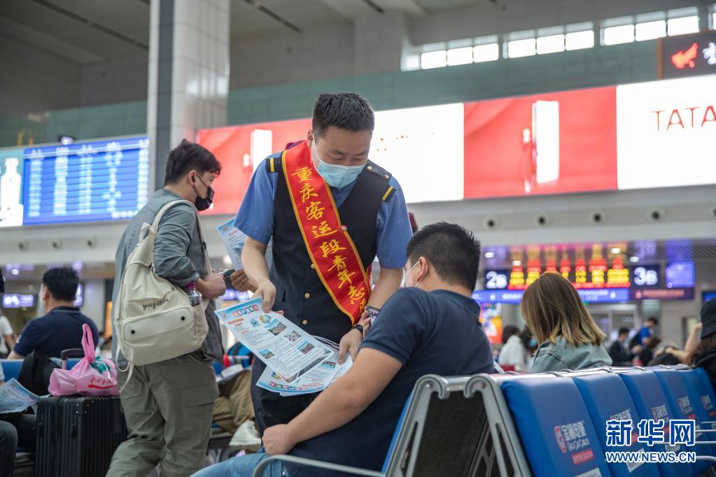 当日,中国铁路成都局集团有限公司重庆客运段联合重庆铁路公安处组成爱路护路宣传志愿者小分队,在重庆北站候车大厅和列车站台上,通过多种形式为出行旅客普及铁路安全知识。
