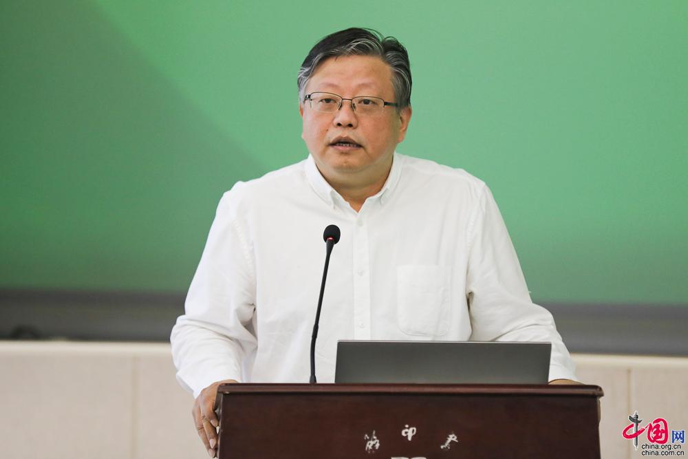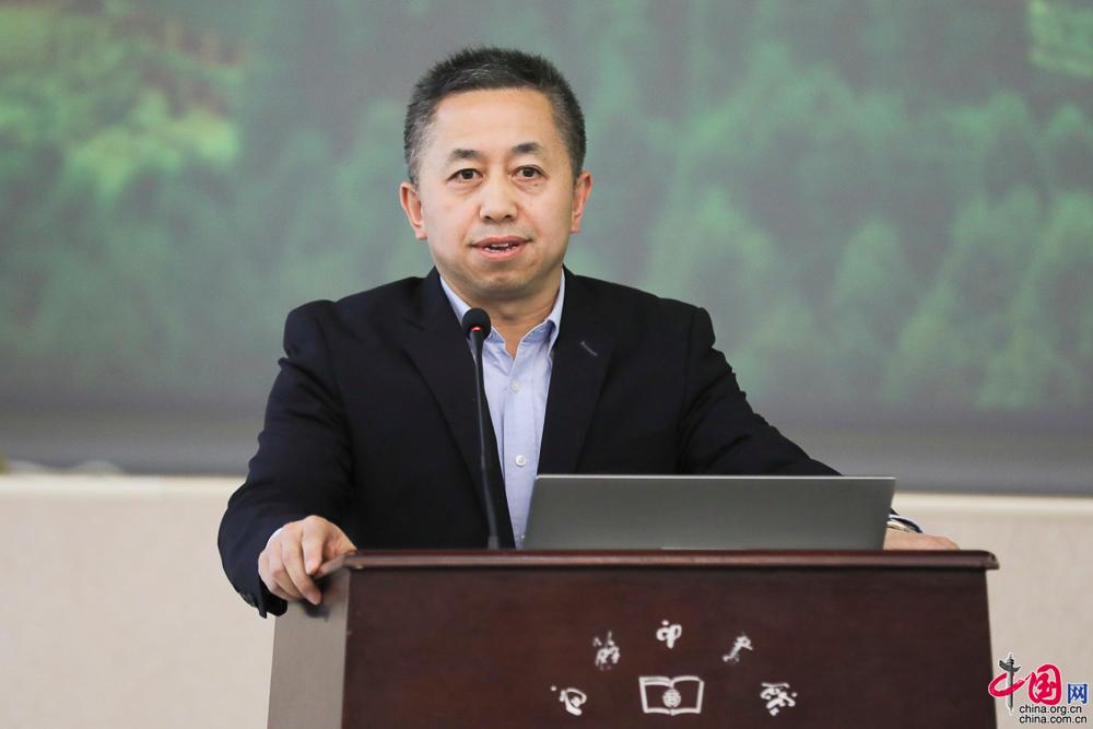 《乡村振兴与可持续发展之路》作者、中国扶贫基金会副理事长兼秘书长刘文奎介绍成书。中国网记者 董宁摄影