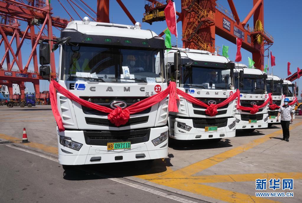 5月28日,在河北唐山港京唐港区集装箱码头,工人从准备投入使用的电动重卡前走过。
