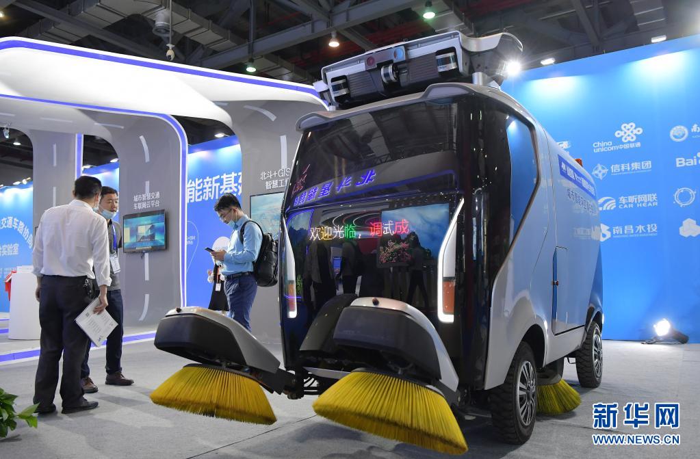5月27日在博览会上拍摄的智能无人驾驶环卫车。