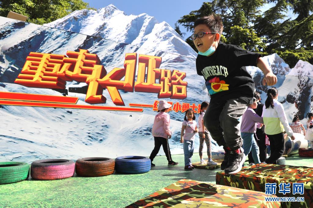 5月29日,小朋友在中国儿童中心的活动上体验“重走长征路”亲子运动会。