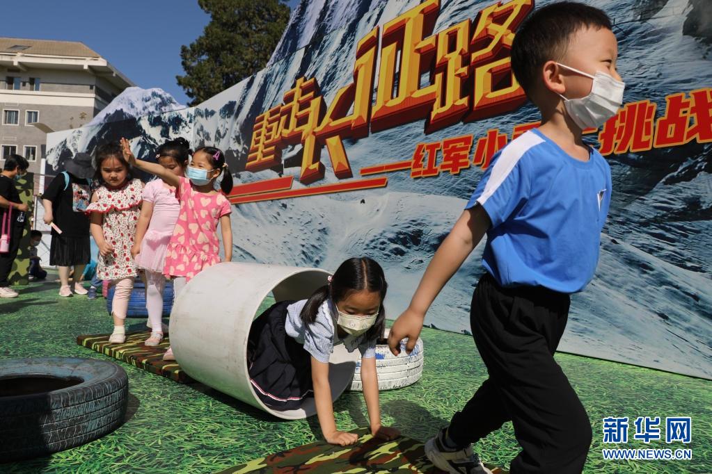 5月29日,小朋友在中国儿童中心的活动上体验“重走长征路”亲子运动会。
