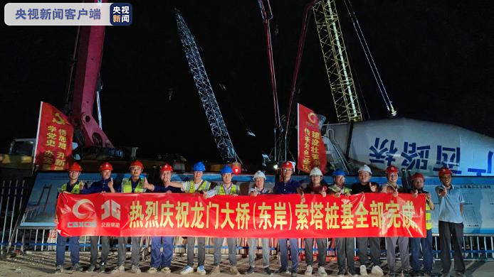 龙门大桥东岸于2月18日正式开始开孔施工,在东岸主塔桩基施工过程中,通过投入国内领先的大扭矩旋挖钻机、机器人焊接臂、一体化钢筋滚丝机等机械设备,有效克服了高强度红砂岩桩基进尺缓慢及钢筋笼加工效率和质量不可控等技术难题。