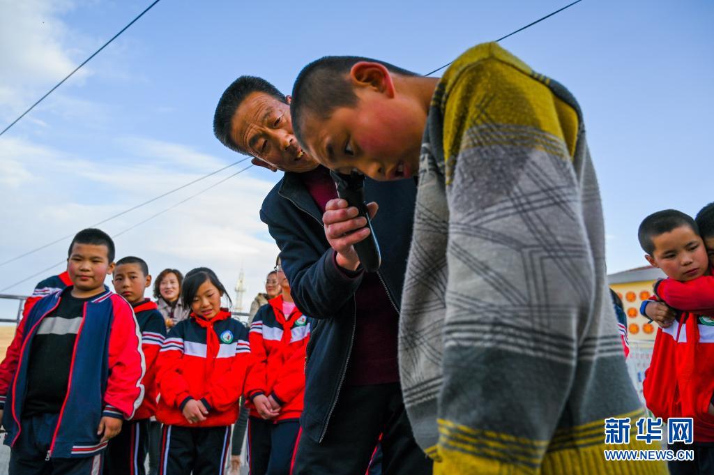 5月28日,大库伦乡小学的老师给学生理发。新华社记者 刘磊 摄