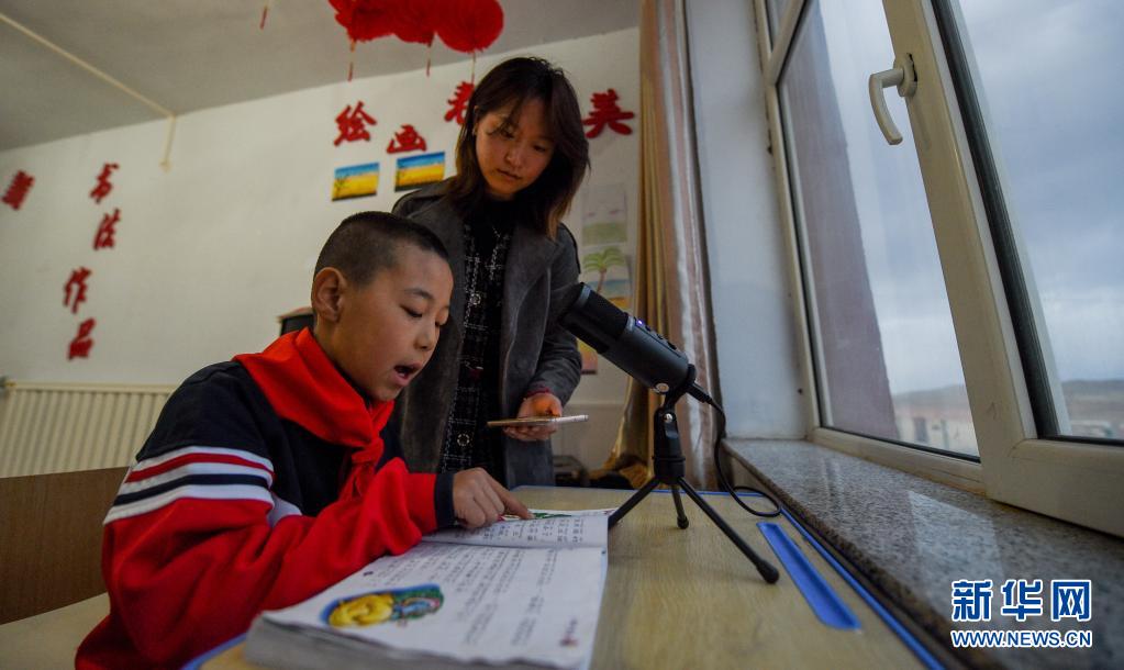 5月28日,老师郭美艳(右)给学生录制朗读音频。新华社记者 刘磊 摄