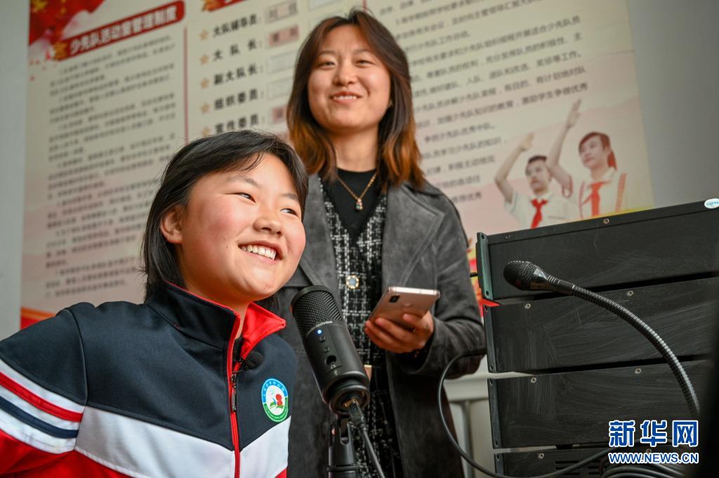 5月28日,老师郭美艳(右)给学生录制朗读音频。新华社记者 连振 摄